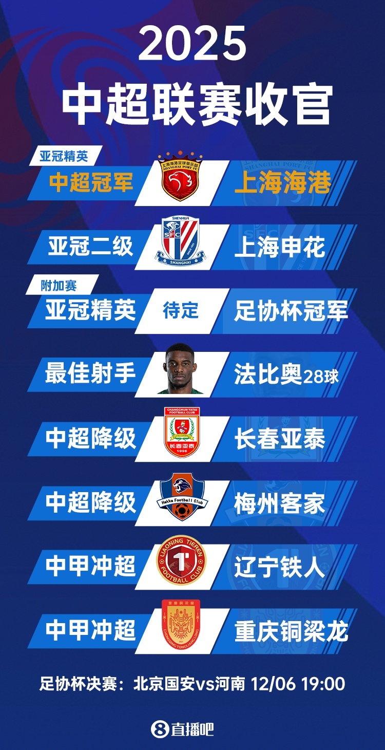 11月22日讯 2025赛季中超落下帷幕,上海海港集结三个赛季夺得中超冠军,上海申花获取亚军,蓉城获季军。长春亚泰和梅州客家降入中甲。法比奥28球夺得本赛季中超金靴奖。