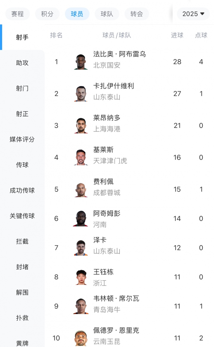中超弓手榜:法比奥末轮大四喜28球夺金靴,瓦科27球第二