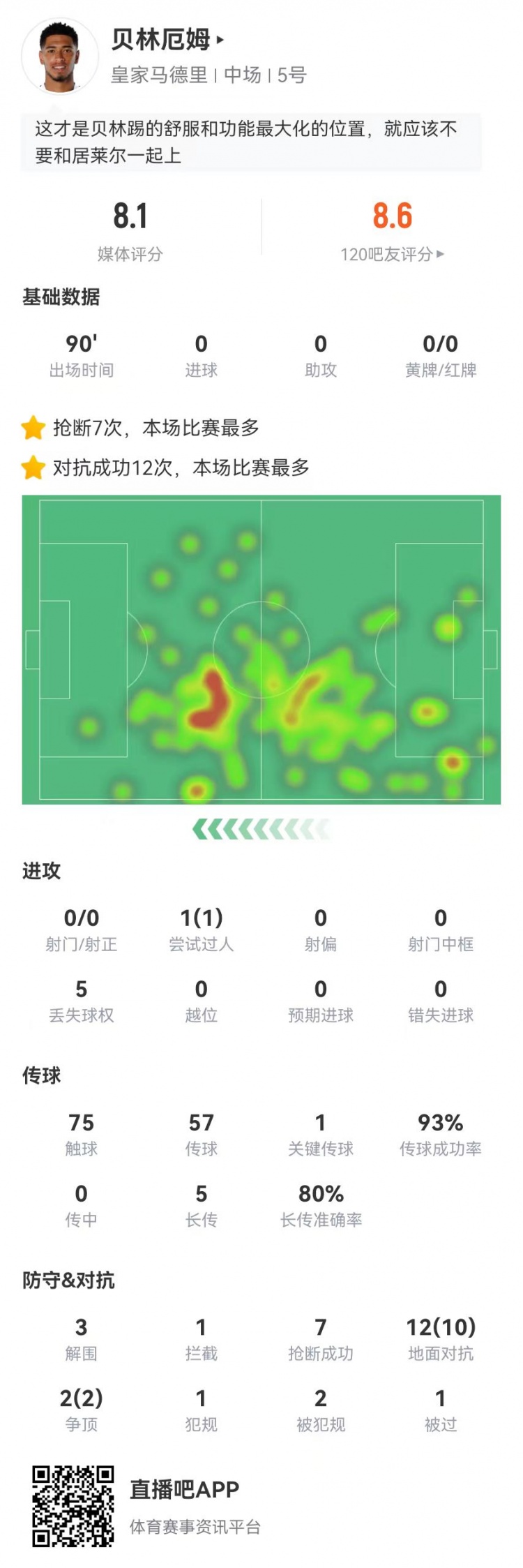12月4日讯 皇马在本轮西甲3-0完胜毕巴,贝林厄姆本场数据如下: