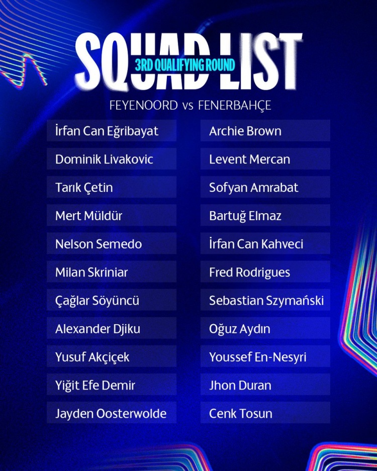 8月5日讯 费内巴切公布了欧冠履历赛第三轮对阵费耶诺德大名单,恩内斯里、弗雷德、阿姆拉巴特、什克在列,夏窗新援阿奇-布朗、塞梅多、杜兰入选。