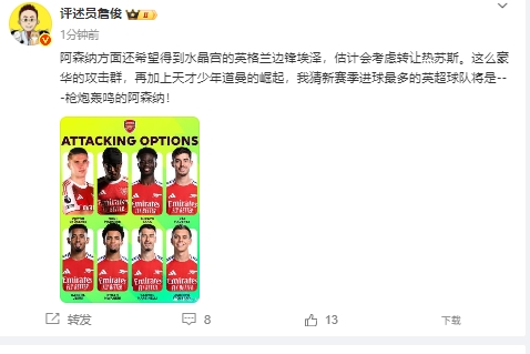 他写谈:“阿森纳方面还但愿取得水晶宫的英格兰边锋埃泽,测度会沟通转让热苏斯。这样豪华的挫折群,再加上天才少年谈曼的崛起,我猜新赛季进球最多的英超球队将是---枪炮轰鸣的阿森纳! ”