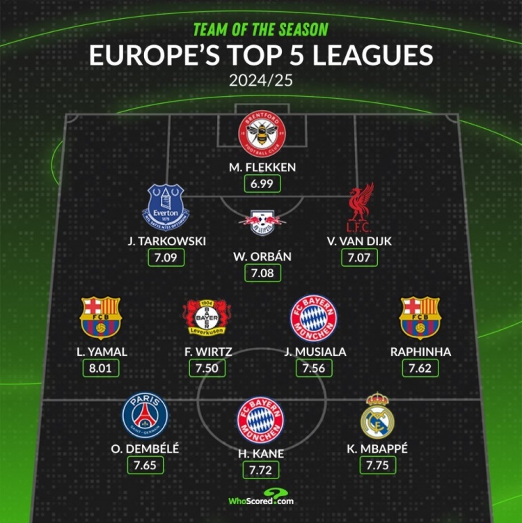 7月29日讯 whoscored统计了24-25赛季的五大联赛赛季评分最好声威,巴萨、拜仁各2将入围。