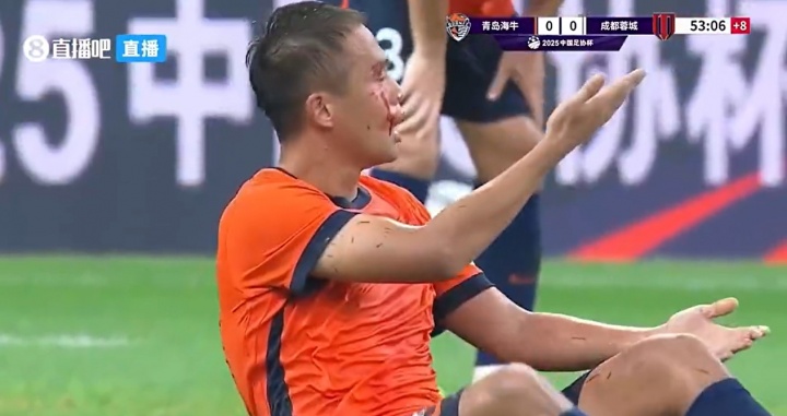 今晚足协杯,青岛海牛vs成都蓉城,上半场补时终末阶段,德尔增加无球气象肘击孙正傲,孙正傲脸部出血!裁判看VAR后出红牌!两边齐10东谈主应战!