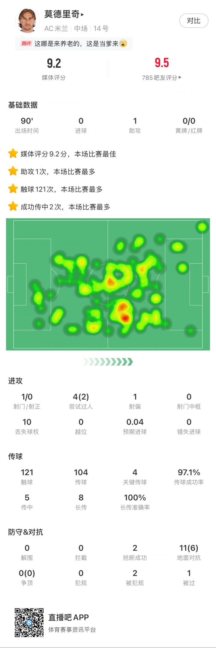 本场比赛,莫德里奇打满全场得到9.2分的高分,4次尝试过东说念主2次成效,121次触球,104次传球,传球成效用97.1%,4次要害传球,送出1次助攻,8次长传一说念成效,2次抢断成效,11次大地反抗6次成效。