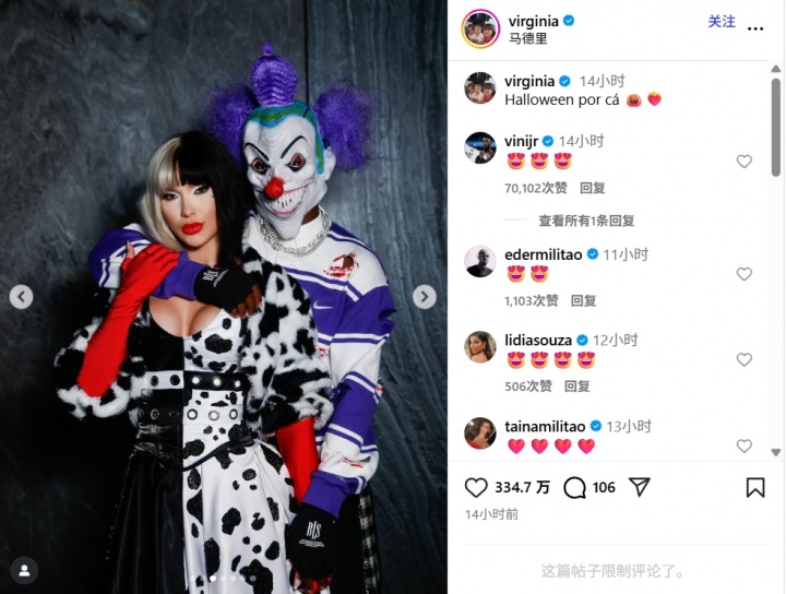 10月30日讯 万圣节行将到来,维尼修斯女友弗吉尼亚在社媒上共享了我方与维尼修斯的万圣节装束。