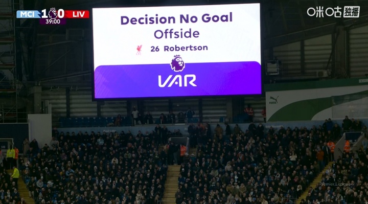 11月12日讯 曼城3-0利物浦比赛的第38分钟,范戴克头球破门,但VAR判定罗伯逊越位位置侵扰,进球被判无效。
