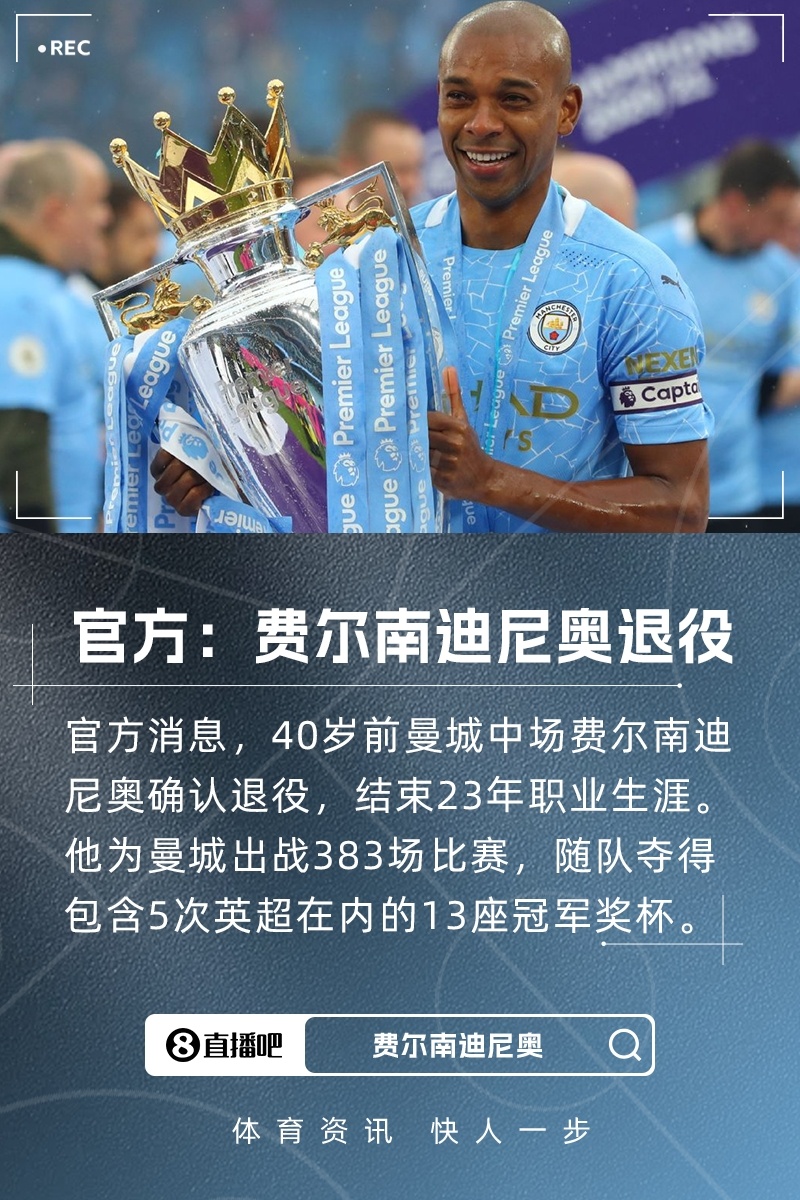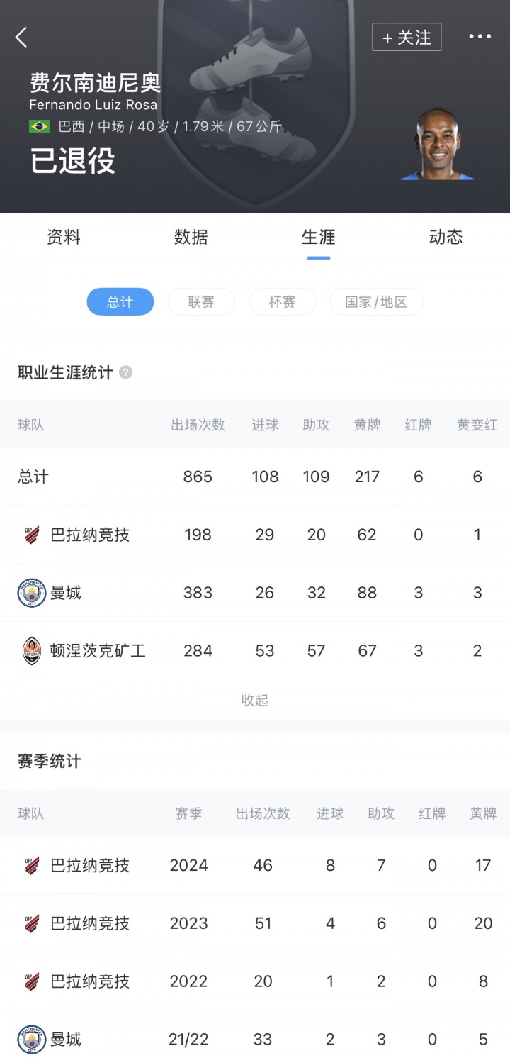 40岁的巴西中场费尔南迪尼奥,生计曾着力于巴拉纳竞技、顿涅茨克矿工、曼城。2013年至2022年着力曼城期间,费尔南迪尼奥共代表球队出战383场比赛,孝顺26球32助,随队夺得包含5次英超在内的13座冠军奖杯。