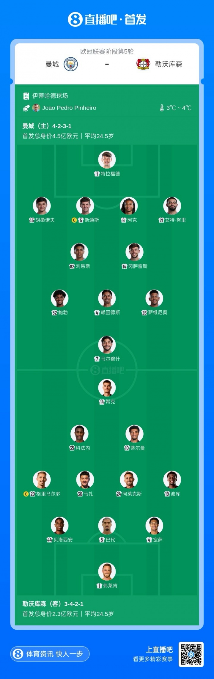 11月26日讯 欧冠联赛阶段第5轮,曼城主场迎战勒沃库森,赛前两边首发公布。【曼城本场大幅轮流,马尔穆什、赖因德斯、胡桑诺夫统统先发,哈兰德、福登、B席镇守替补;药厂方面,希克、格里马尔多、宽萨先发出战,本·塞吉尔、埃切维里替补待命。】