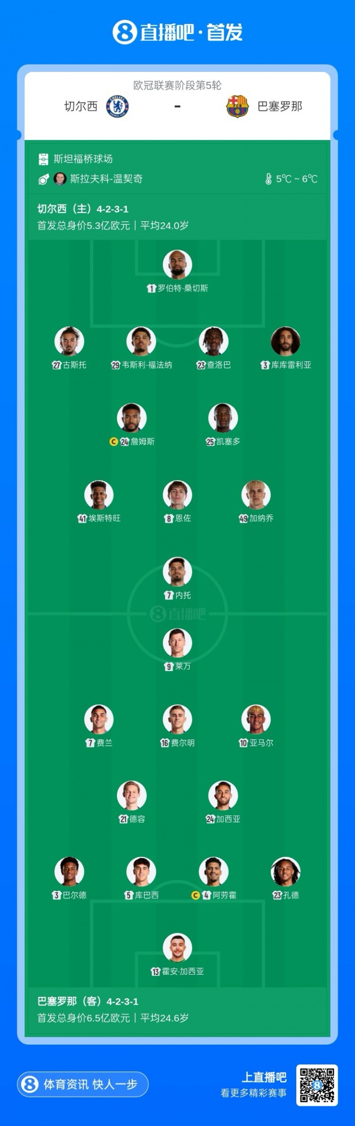 11月26日讯 凌晨04:00,欧冠联赛阶段第5轮,切尔西主场迎战巴塞罗那,赛前首发名单公布。【切尔西方面,内托、埃斯特旺、加纳乔构成锋线组合;巴萨方面,费兰、莱万、亚马尔先发,拉什福德和拉菲尼亚替补。】