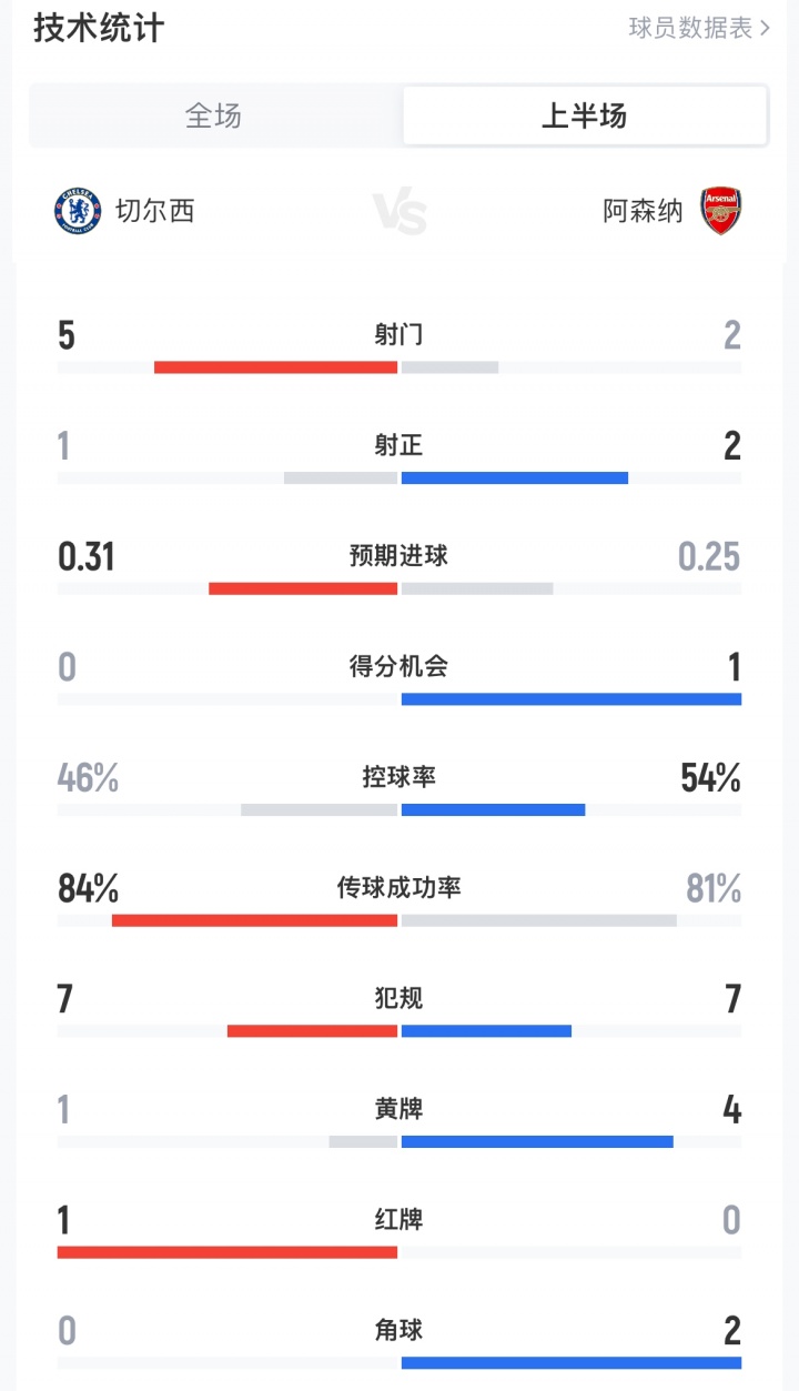 炸药味悉数!切尔西vs枪手半场:犯规数7-7,切尔西1红1黄枪手4黄