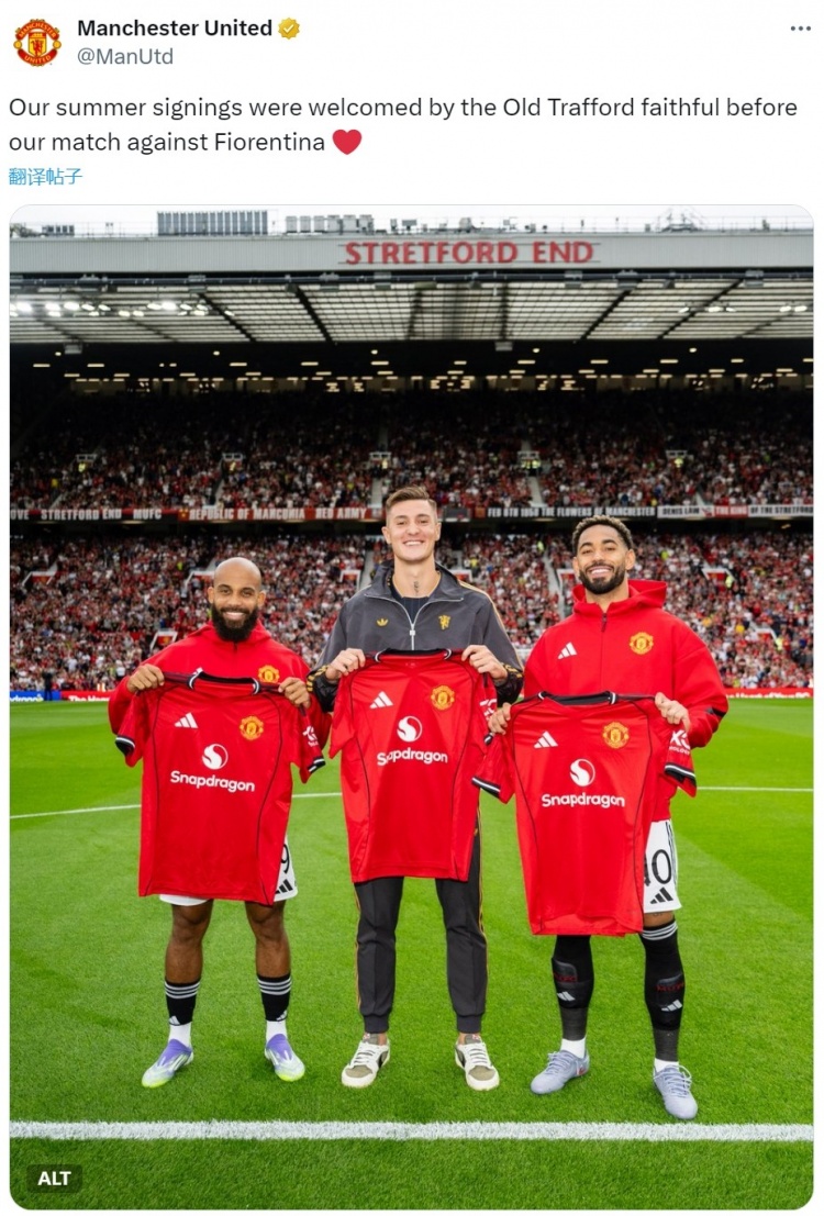 曼联在今晚的友谊赛中对阵佛罗伦萨,比赛在老特拉福德进行,赛前库尼亚、姆贝莫、塞斯科在球场内亮相,受到球迷的接待,曼联官方社媒晒出这三位新援的合照。