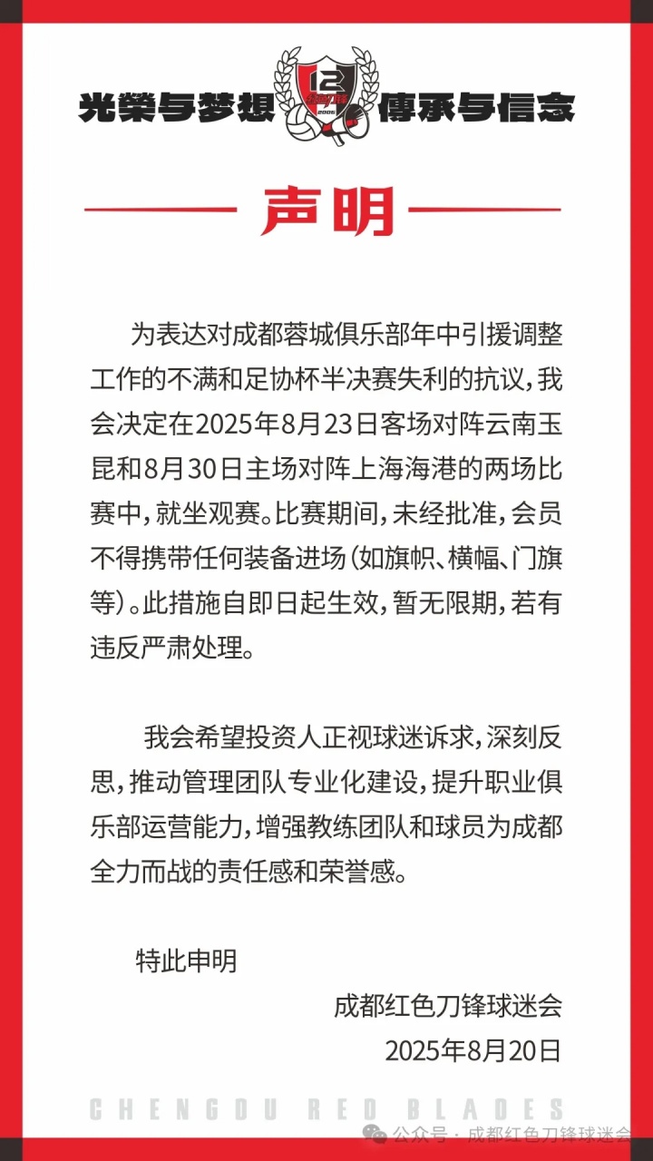为抒发对成齐蓉城俱乐部年中引援转念使命的动怒和足协杯半决赛失利的抗议,我会决定在2025年8月23日客场对阵云南玉昆和8月30日主场对阵上海海港的两场比赛中,就坐不雅赛。比赛本事,未经批准,会员不得佩带任何装备进场(如旌旗、横幅、门旗等)。此门径自即日起收效,暂无尽期,若有违犯严肃处理。