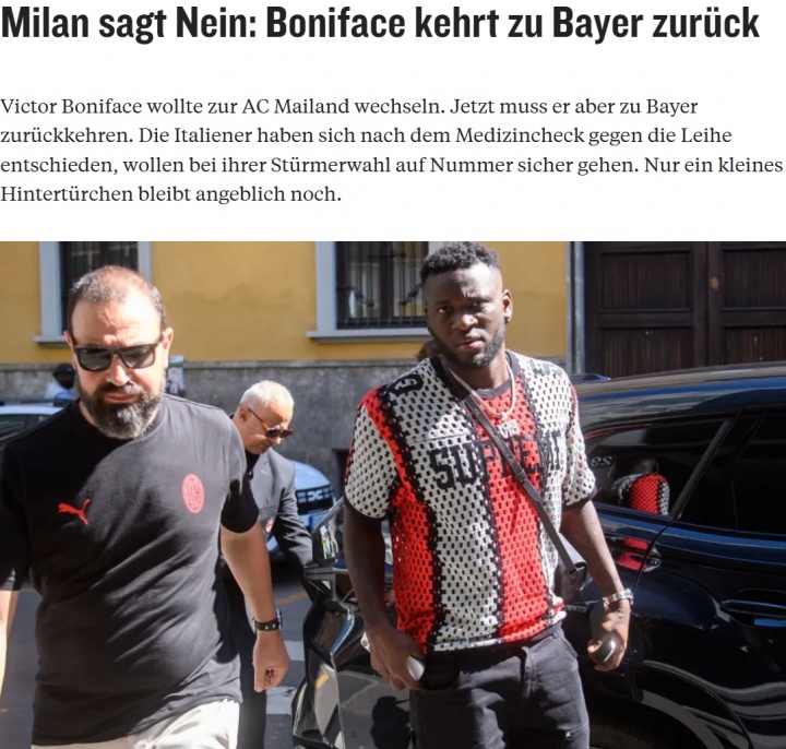米兰与药厂底本已就一项包含买断条目的租赁契约罢了一致,据悉为500万欧租赁外加2400万欧买断。但在博尼法斯罗致意大利方面安排的强制体检后,这笔来回最终被AC米兰否决,博尼法斯因此不得不复返德国。