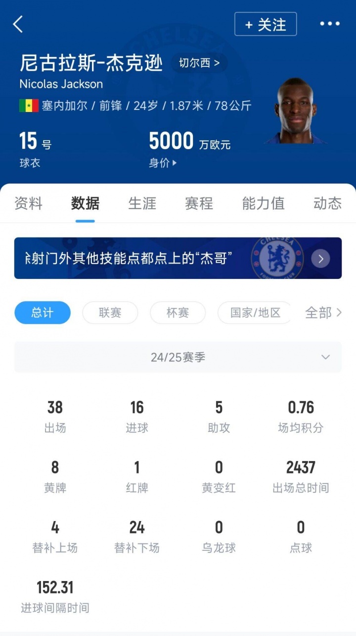 现年24岁的塞内加尔国脚杰克逊身价5000万欧,上赛季为切尔西出战38场收货16球5助。