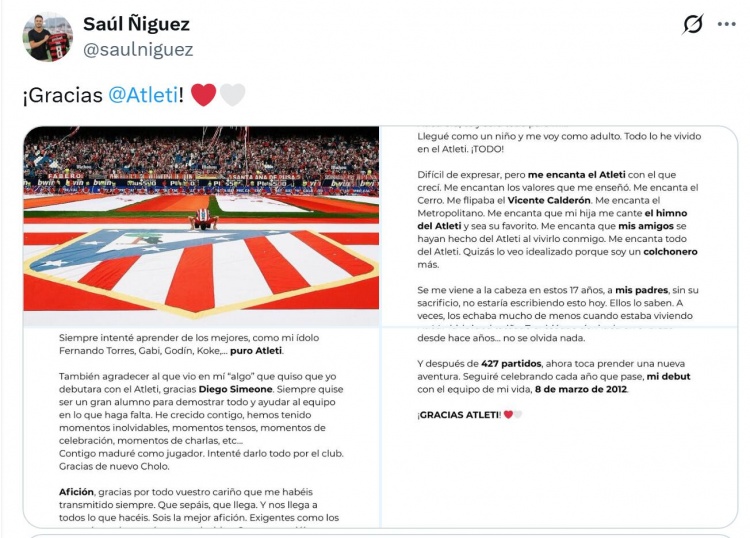 7月24日讯 在阐述我方将加盟弗拉门戈后,萨乌尔更新社媒告别马竞。