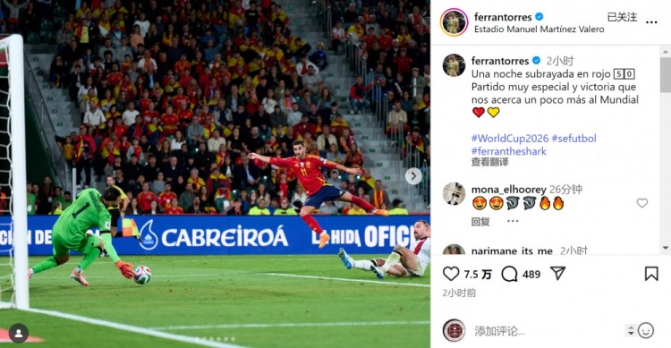 此役是费兰-托雷斯为西班牙队出战的第50场比赛,他在酬酢媒体上晒出比赛相片,配文:“值得记得的夜晚,为西班牙出战50场,这是一场稀奇稀奇的比赛,告捷让咱们距离宇宙杯更近一步。”