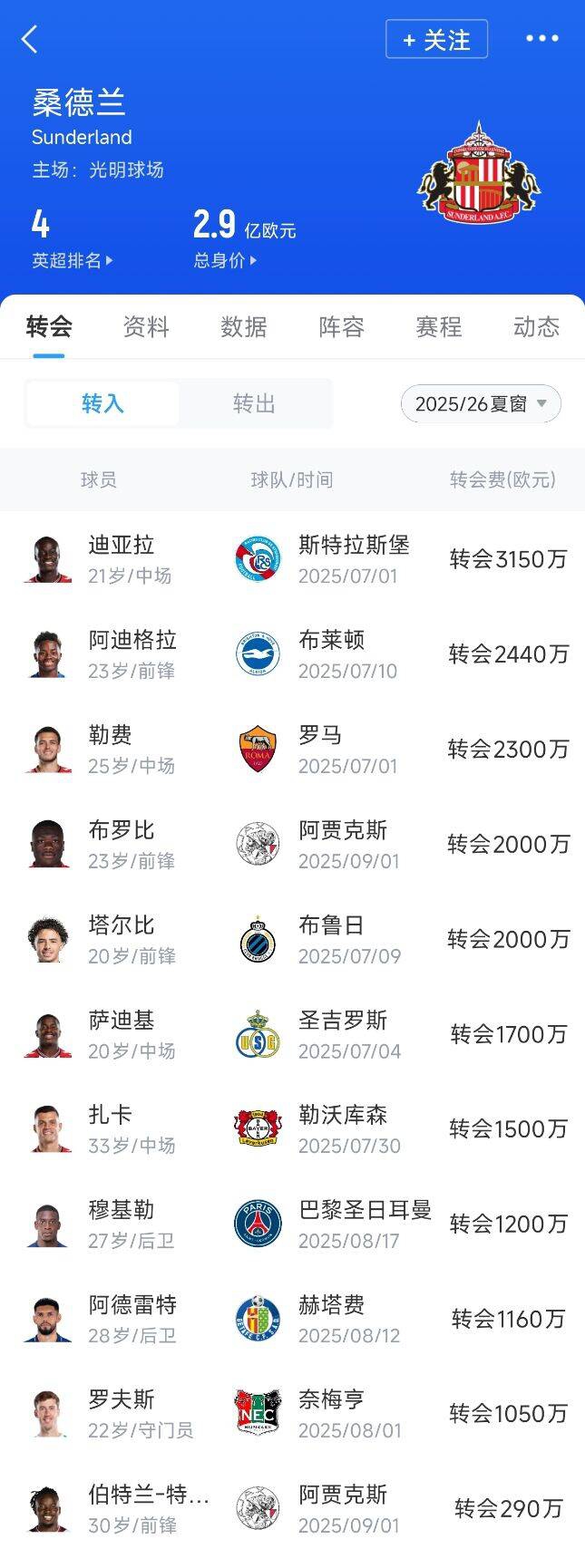 桑德兰夏窗引援:不含租出