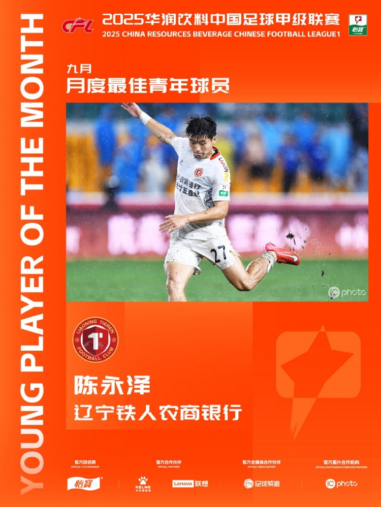 10月31日讯 中甲联赛官方告示9月最好后生球员,辽宁铁东谈主球员陈永泽当选,他在比赛中赢得1球1助攻。