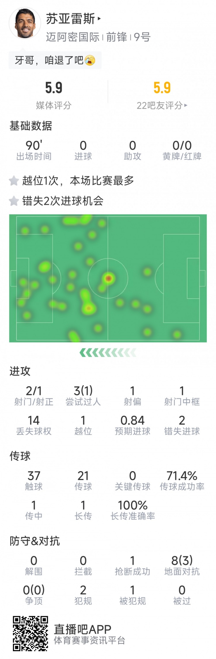 11月2日讯 在好意思职联季后赛第二场,迈阿密外洋1-2不敌纳什维尔。以下为苏亚雷斯本场数据: