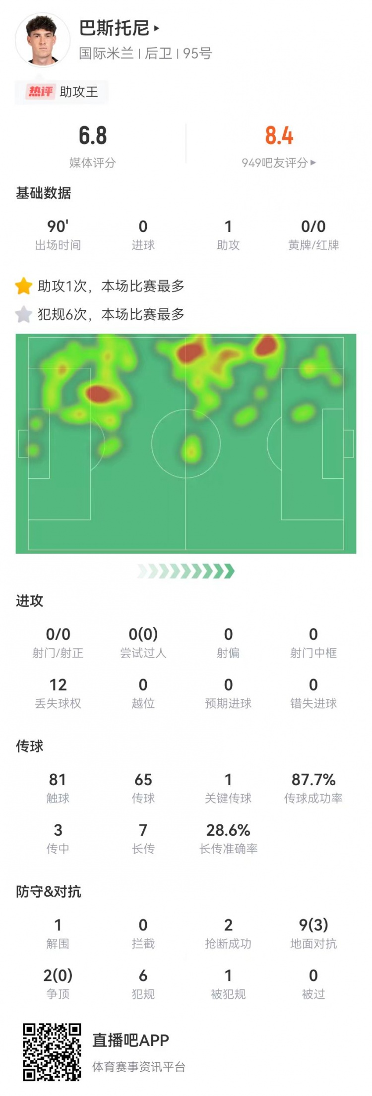 11月10日讯 国米在本轮意甲2-0力克拉皆奥,巴斯托尼本场数据如下: