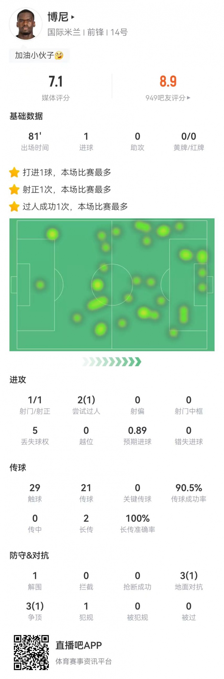 11月10日讯 本轮意甲焦点战国米2-0力克拉王人奥,博尼本场数据如下: