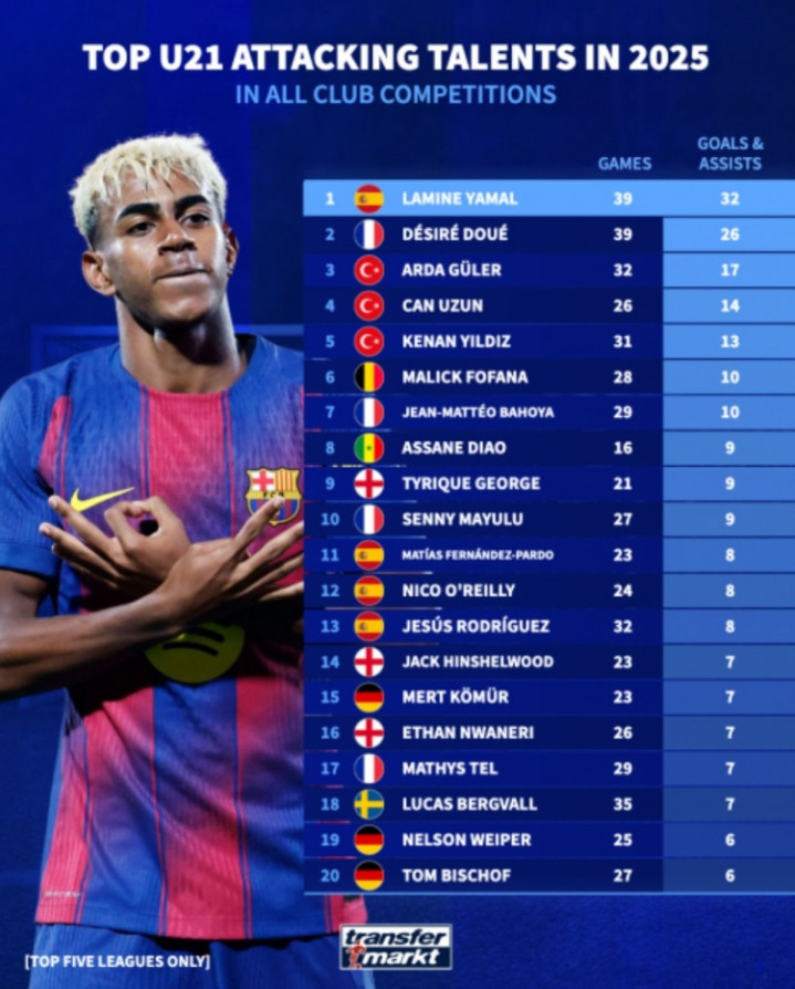 直播吧10月10日讯德国转会市集清点了2025年俱乐部层面各项赛事参与进球最多U21球员,亚马尔39场32球居首,杜埃39场26球位居次席。