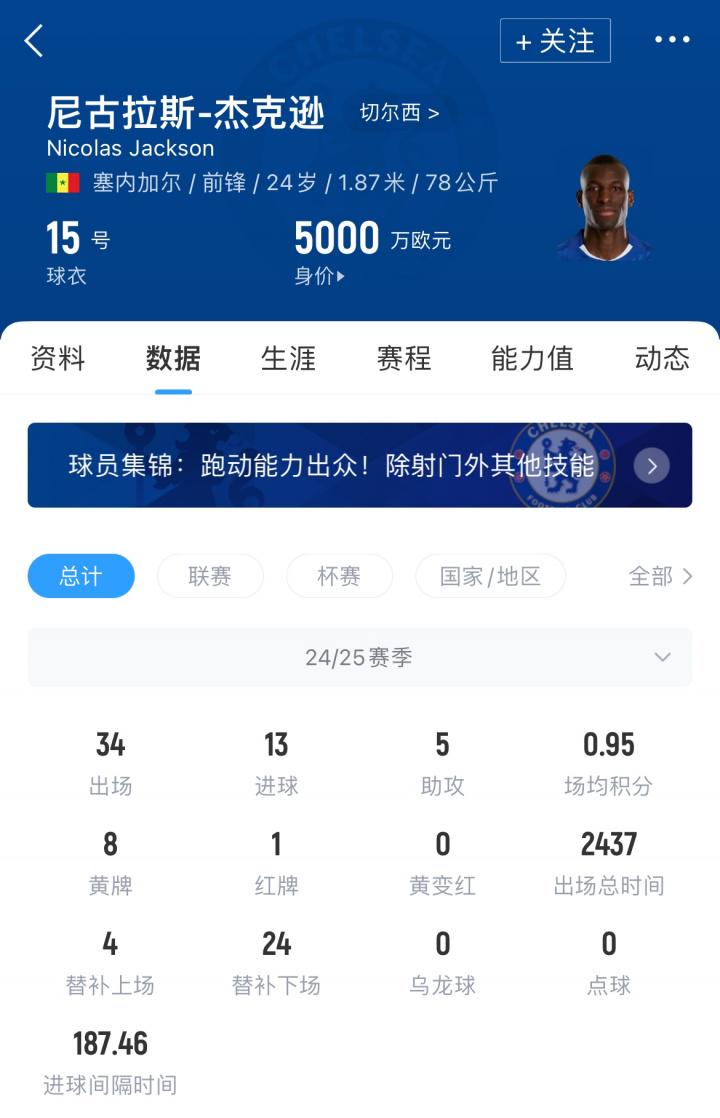 杰克逊上赛季为切尔西出场34次,赢得13粒进球和5次助攻,当今其德回身价为5000万。