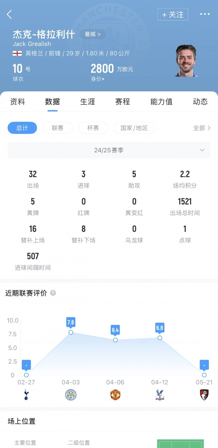 格拉利什2021年夏窗以1.18亿欧元转会费加盟曼城,规章现在共为曼城出场157次打入17球23助攻。
