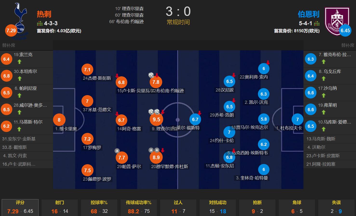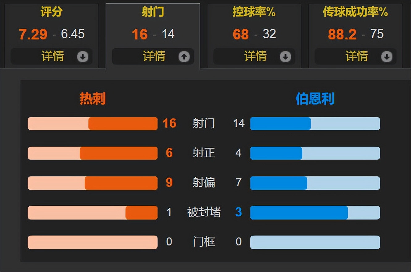 全场比赛,热刺的控球率为68%,一共有16次射门,其中6次射正;伯恩利一共有14次射门,其中4次射正。热刺新帅新赛季新款式,相当是东谈主均20岁的三中场,跟着比赛磨合以及涨球,热刺翌日值得期待。