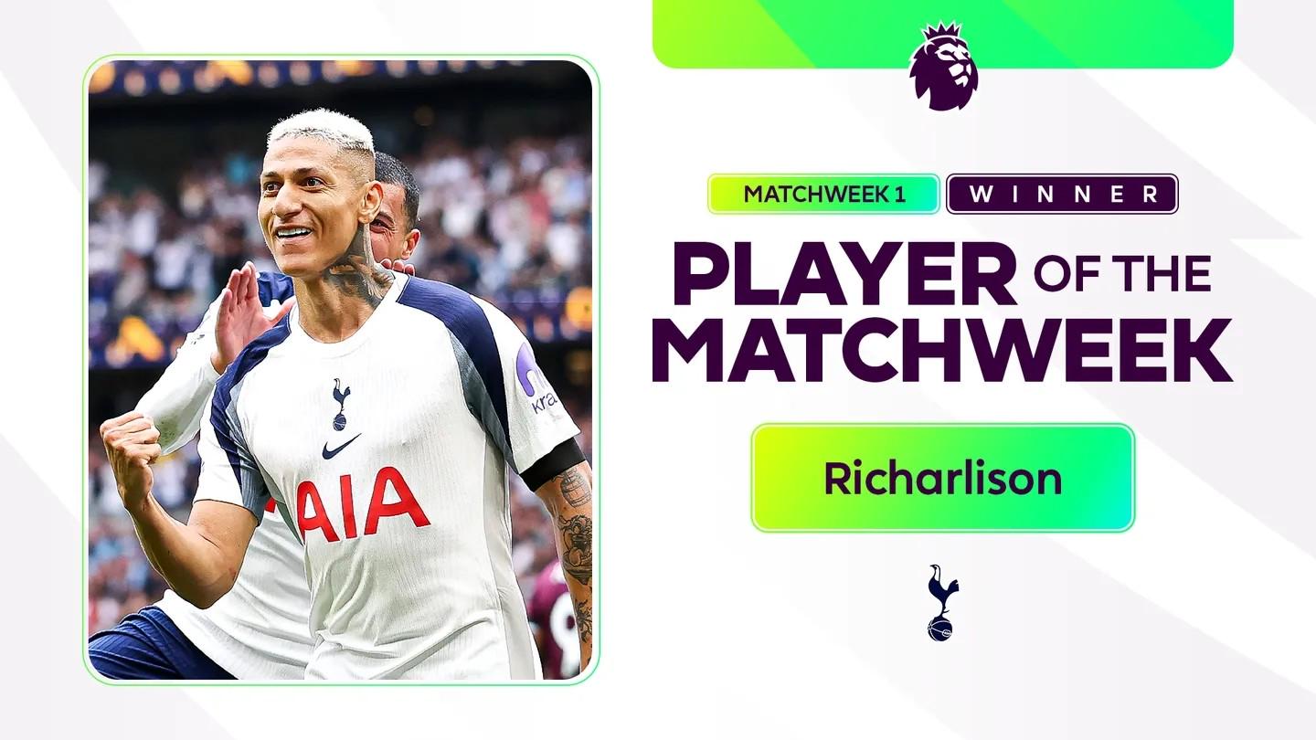 官方音讯,托特纳姆热刺前卫里沙利松当选新赛季英超第1轮最好球员。