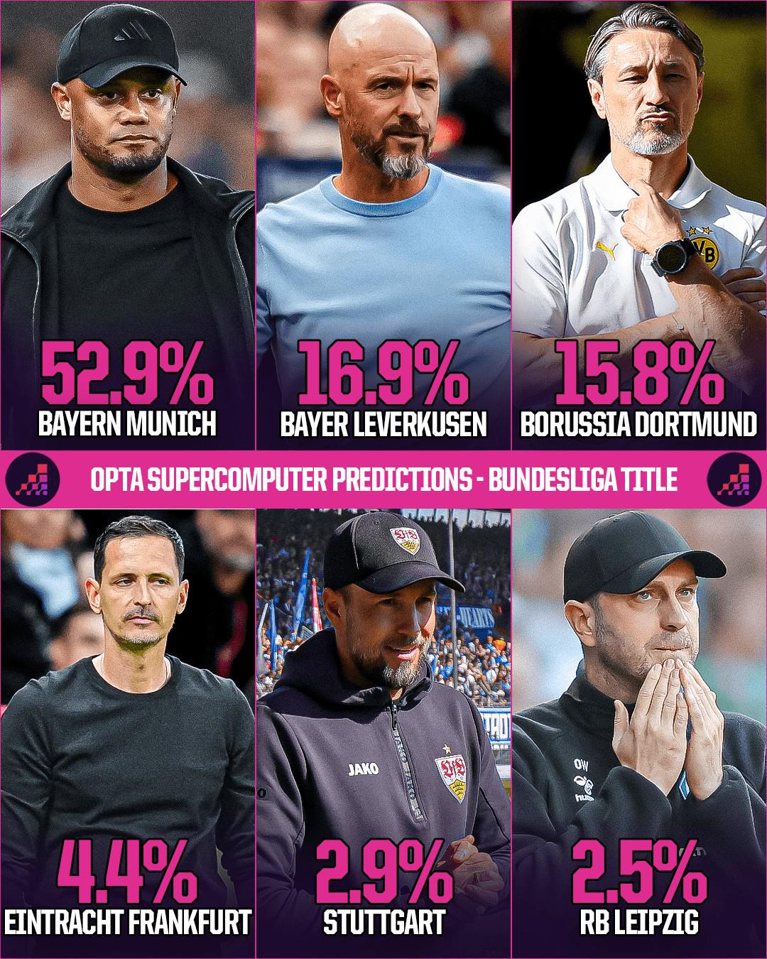 2025-26赛季德甲行将打响,驰名数据机构Opta在开赛前瞻望了德甲夺冠、前四名以及左迁概率。