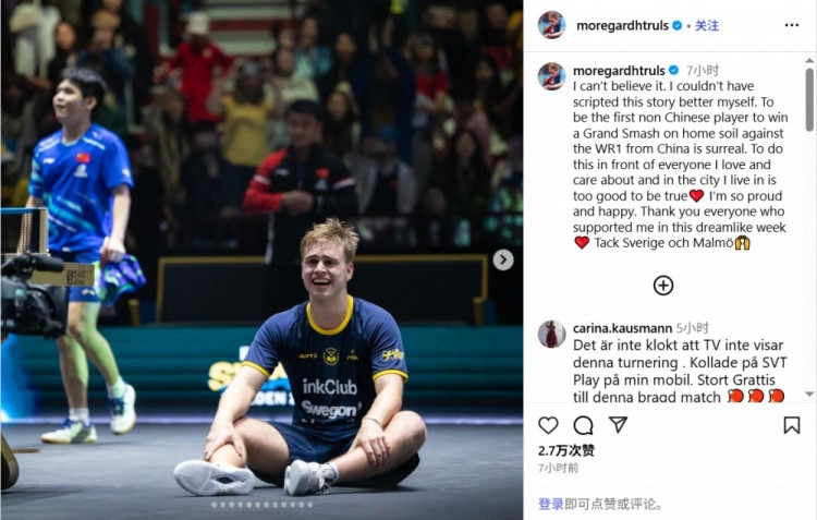 赛后,莫雷加德更新社媒庆祝这个艰苦宝贵的冠军。莫雷加德写说念:难以置信!我险些不敢确信这个故事能如斯完满。成为首位在主场打败天下名次第一的中国选手,赢得大满贯赛事的非中国选手,这种嗅觉太不真确了。在我所爱和见谅的东说念主眼前,在我糊口的城市中赢得这么的配置,险些像作念梦相似我感到无比骄气和闲隙。感谢扫数在这黑甜乡般的一周里赈济我的东说念主感谢瑞典和马尔默的赈济。