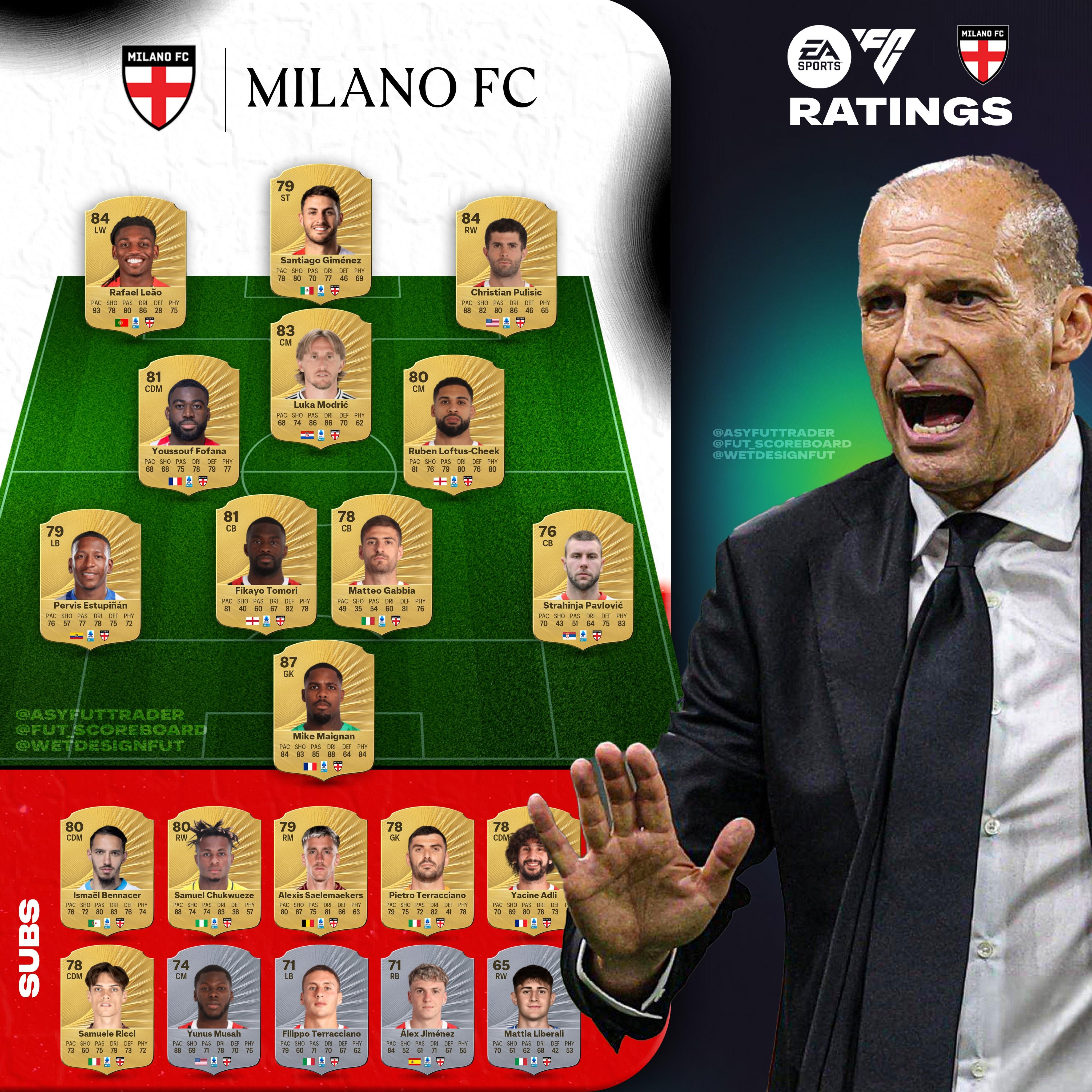 泰斗FC博主ASY败露了米兰球员在《FC26》中的评分,其中,迈尼昂87、莱奥和普利希奇84、莫德里奇83。