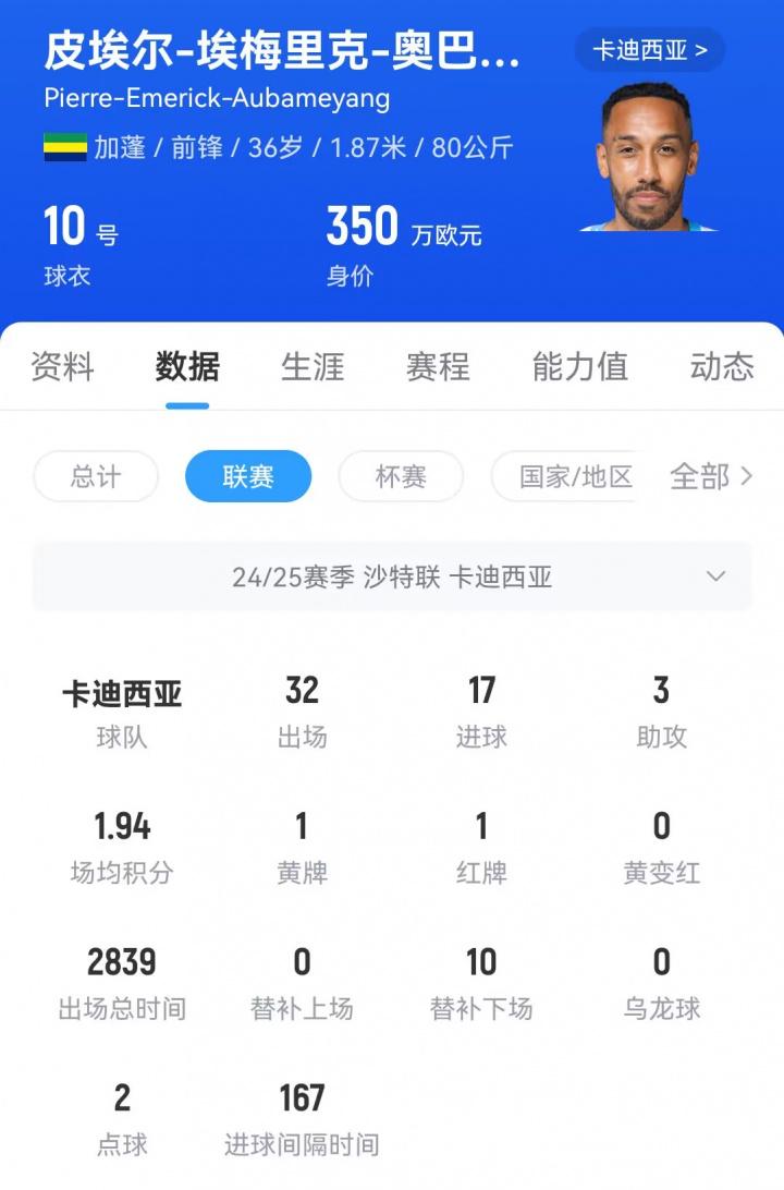 上赛季,奥巴梅杨为卡迪西亚在沙特联赛出场32次,孝敬17球3助攻,球员现在的身价为350万欧元。