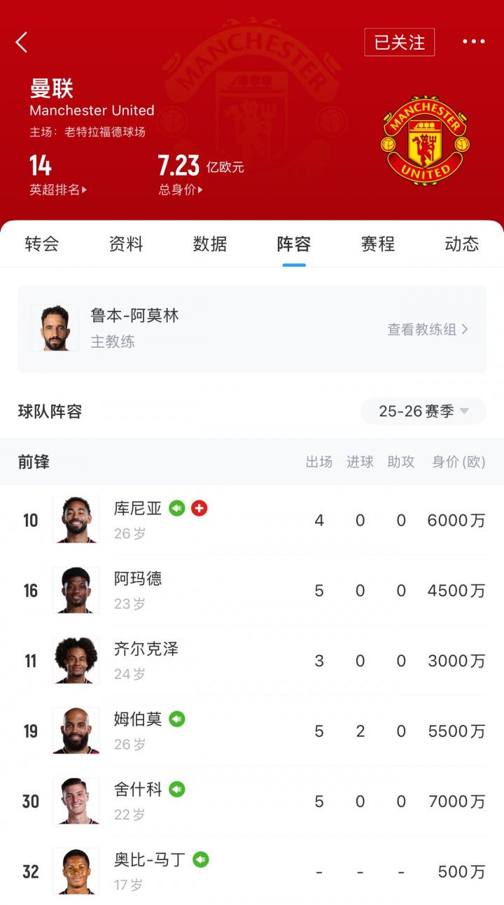 库尼亚(身价6000万欧):4场301分钟(伤缺曼市德比),0进球0助攻