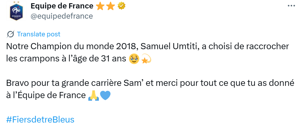 法国国度队社媒写说念:“咱们的2018年寰宇冠军成员萨穆埃尔·乌姆蒂在31岁时采用退役。祝福你获取的光辉工作生活,萨穆埃尔,感谢你为法国队付出的一切。”