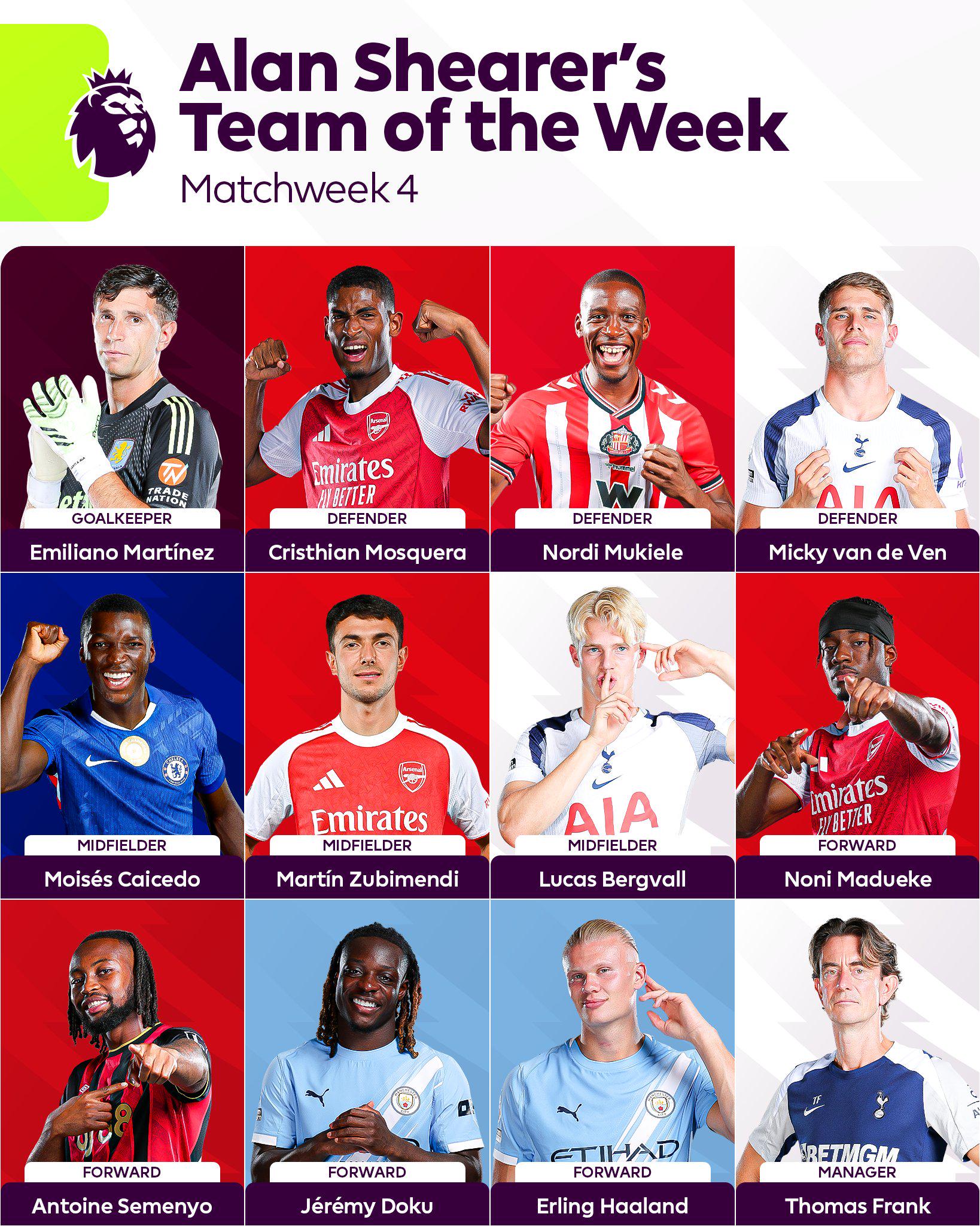 雷速体育9月16日讯 英格兰传说先锋阿兰·希勒选出了他心目中的英超第4轮最好声威,其中阿森纳共有3名球员入选,本轮发挥出色的哈兰德、贝里瓦尔等东谈主也均在列。