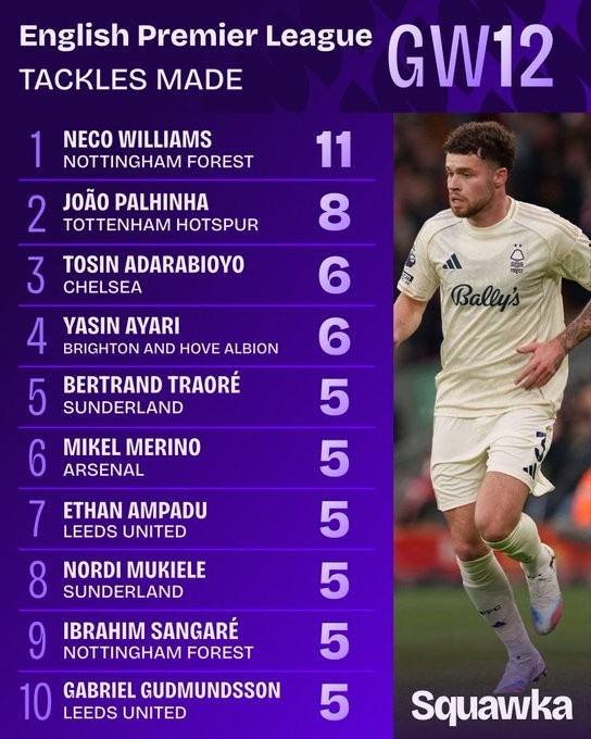 值得一提的是,11次生效抢断既是诺丁汉丛林升上英超之后的单场抢断记录,亦然本赛季英超球员单场最多。