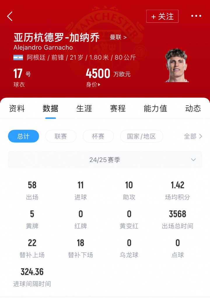 加纳乔现年21岁,上赛季各赛事出场58次,孝顺11球10助。现在球员德回身价为4500万欧元。