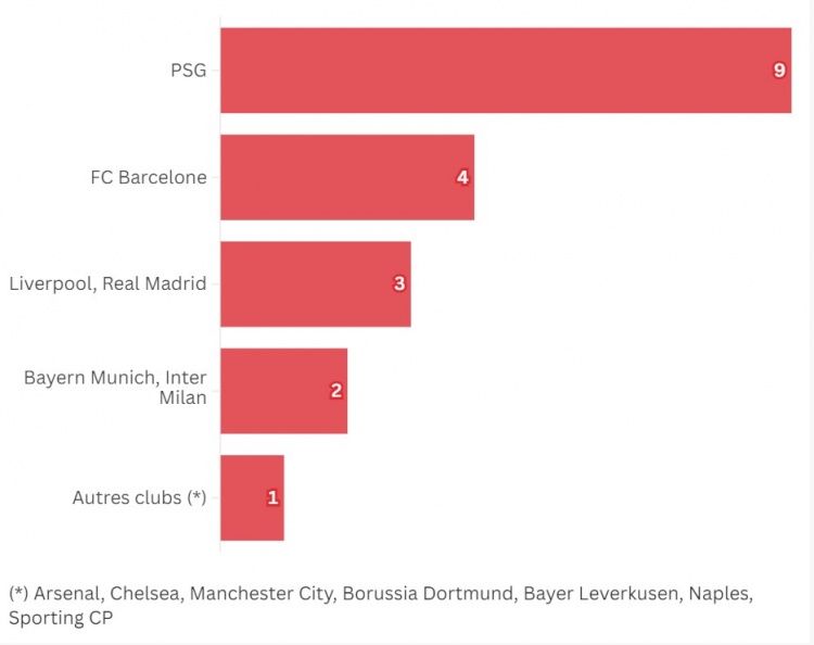 在2025年金球奖的30名提名者中,有9名球员来自巴黎圣日耳曼俱乐部。这一数字追平了皇家马德里在2003年(那时提名名单为50东谈主)和2018年的记录。