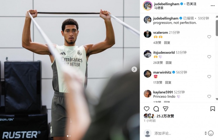 贝林厄姆在个东谈主社媒晒出我方进行康复进修的相片,配文写谈:“有一些推崇,但还不够完竣。”
