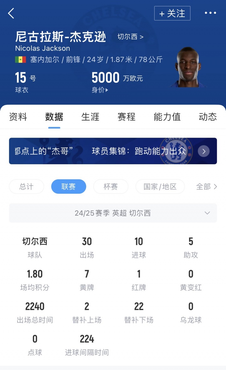 杰克逊现年24岁,现在德回身价5000万欧,切尔西2023年破费3700万欧从比利亚雷亚尔将其引进。上赛季杰克逊为切尔西出战38场收货16球5助。