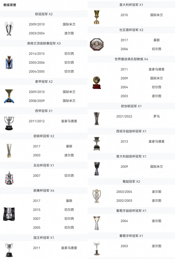 欧联冠军2个:2016/17赛季(曼联)、2002/03赛季(波尔图)