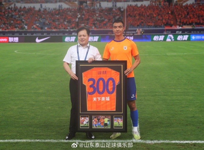 队员刘彬彬结束了他在山东泰山队生存300场比赛的里程碑,山东泰山足球俱乐部总司理周培建在赛前为刘彬彬颁发了300场挂牵球衣。刘彬彬是出自泰山青训的优秀球员,祝福刘彬彬!