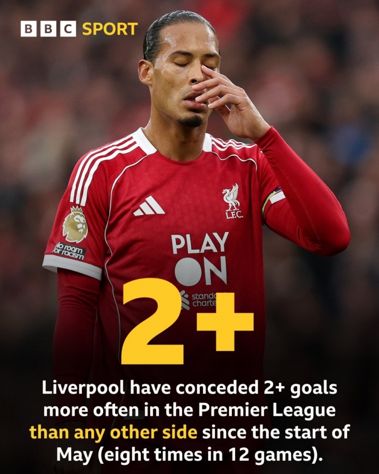 据BBC统计,5月初以来,利物浦干涉12场英超比赛,其中8场至少丢掉2球,同时丢球2+场次英超球队中最多。