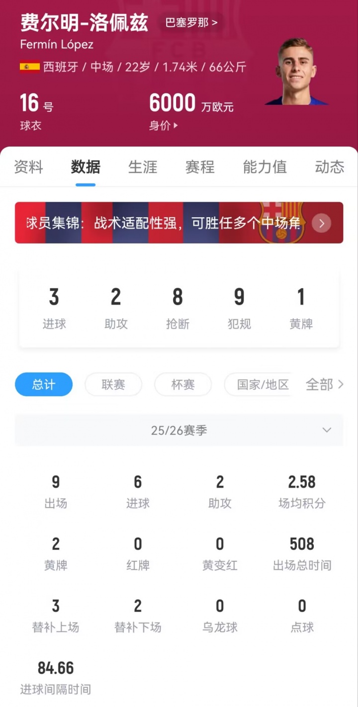 近3场比赛中,费尔明为巴萨狂轰4球2助攻,包括欧冠对奥林匹亚科斯的帽子戏法,以及国度德比中为巴萨打进的扳平进球。新赛季,费尔明在各项赛事为巴萨出战9次,孝顺6球2助攻。