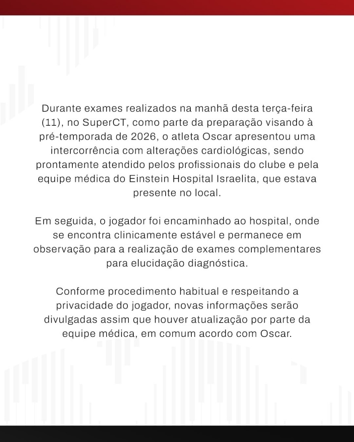 动作备战 2026 年季前赛的一部分,在本周二(11日)上昼于 SuperCT 进行的搜检中,知晓员奥斯卡出现腹黑绝顶情况,就地由俱乐部专科东说念主员及现场的以色列埃因斯坦病院医疗团队进击救治。随后,球员被转送至病院,现在临床情况雄厚,并留院不雅察以进行进一步搜检明确会诊。按照常规并尊重球员诡秘,后续信息将在医疗团队与奥斯卡共同快活后实时更新。