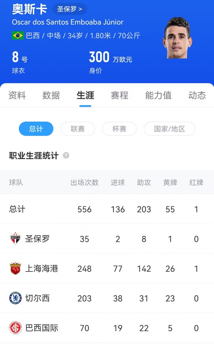 34岁的奥斯卡做事生存曾效用巴西海外、切尔西、上海海港、圣保罗,上赛季中超摈弃后他目田身回到巴西,加盟圣保罗。