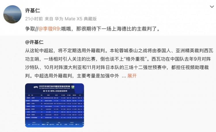 直播吧8月3日讯 关于集合上命令下一轮中超上海德比邀请洋哨的声息,足协副主席许基仁在个东说念主社媒赐与了回复。