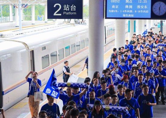新华社像片,南京,2025年6月14日 6月14日,球迷们抵达淮安东站。 当日,2025年江苏省城市足球联赛第四轮淮安队对阵南京队的比赛在江苏省淮安市举行,铁路部门开行南京站往来淮安东站的长三角首趟“苏超”球迷高铁专列,通俗南京球迷前去不雅赛。 新华社发(苏阳 摄)